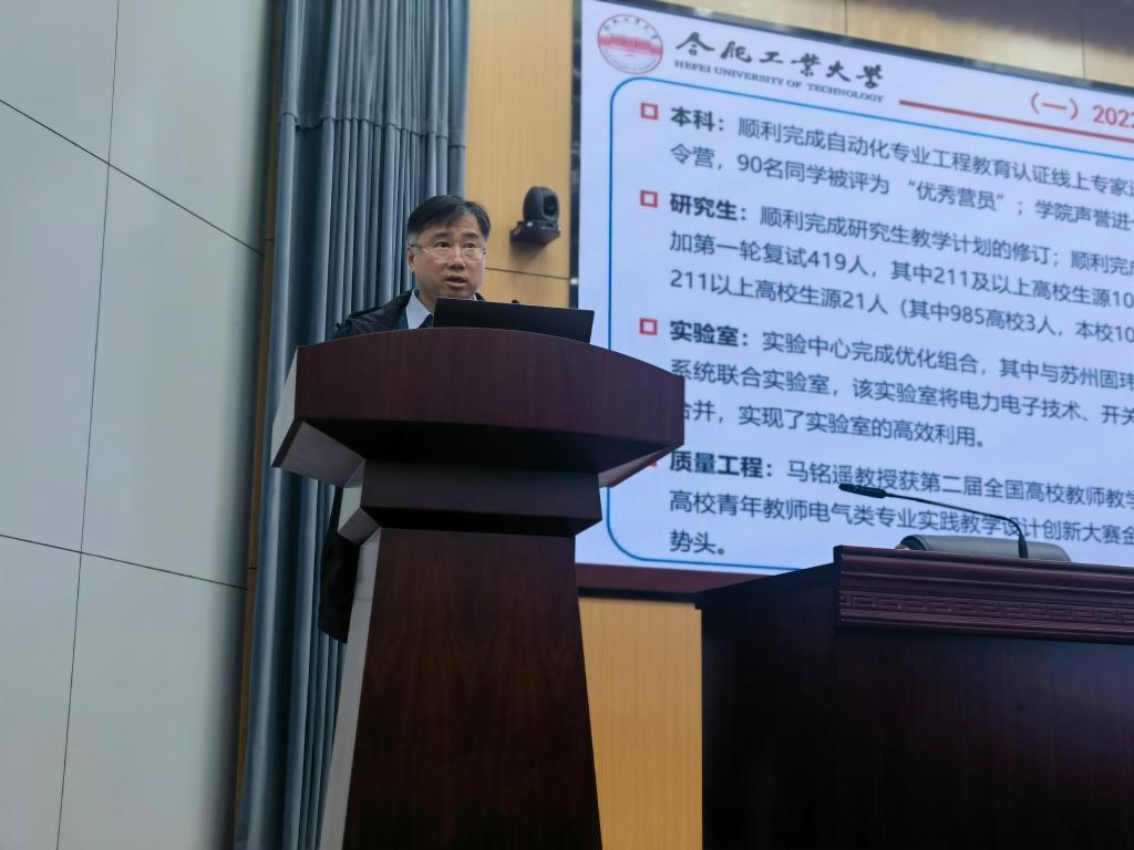 3月22日下午,电气与自动化工程学院在屯溪路校区学术会议中心大报告厅召开了2023年工作布置会。副院长孙伟主持会议,学院领导班子成员及全院教职员工参加了会议。