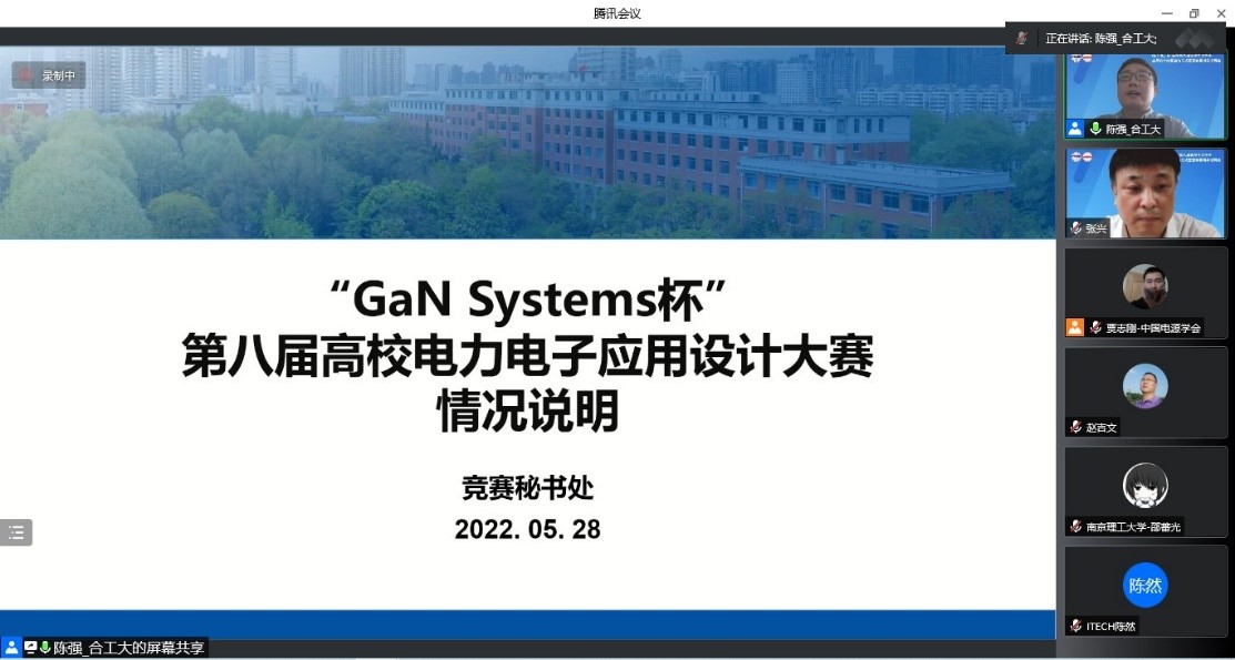 2022年5月28日,由中国电源学会、中国电源学会科普工作委员会主办、合肥工业大学电气与自动化工程学院承办的“GaN Systems杯第八届高校电力电子应用设计大赛“启动仪式暨参赛辅导说明会成功线上举行。