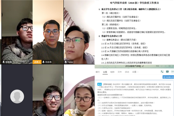 为深入贯彻落实教育部、安徽省疫情防治工作要求,落实学校新型冠状病毒感染肺炎疫情防治学生工作视频推进会会议精神,将疫情期间的学生工作落细落实,2月8日—2月9日,电气学院各年级辅导员分别组织召开抗击疫情线上网络主题班会。