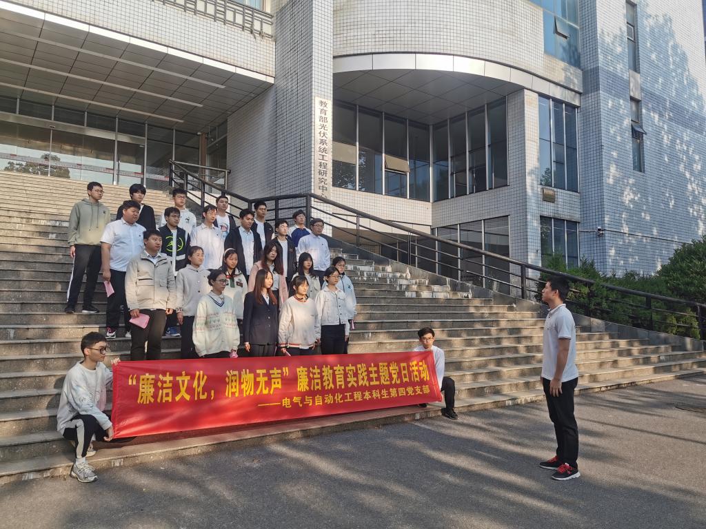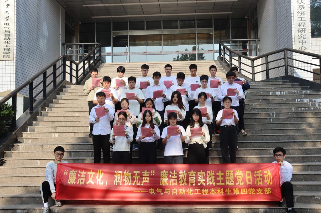 4月26日清晨,电气与自动化工程学院本科生第四党支部全体党员在逸夫楼前开展“廉洁文化,润物无声”廉洁教育实践主题党日活动。
