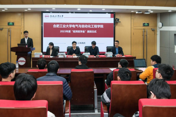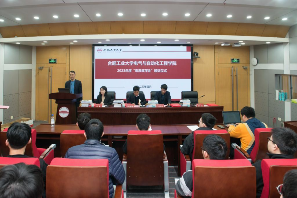 学院学生工作办公室副主任左能宣读了《关于表彰合肥工业大学2023年度“宏湃奖学金”获得者的决定》。“宏湃奖学金”获奖学生代表程乐在发言中代表全体获奖学生向宏湃信息技术有限公司以及辛勤培育学生的母校和老师致以诚挚的敬意和衷心的感谢。他表示作为新时代的电气人,要将“工业报国”情怀深深植根于心,肩负起当代大学生的责任,矢志不渝坚持理想,不负母校培养,为国家、社会和电力行业的发展贡献工大学子的青春力量。
