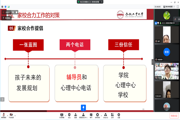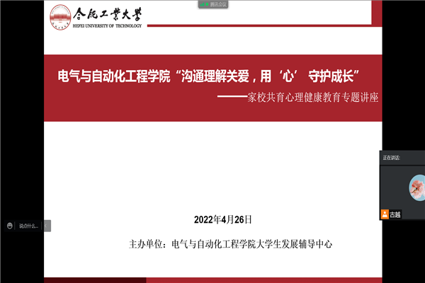 为向学生家长普及大学生心理健康知识,进一步发挥家校协同育人作用,4月26日晚,电气与自动化工程学院通过腾讯会议平台举办“沟通理解关爱,用‘心’守护成长”家校共育心理讲座。活动邀请学校心理健康教育与咨询中心骆贵老师主讲,2021级200余位学生家长参与活动。