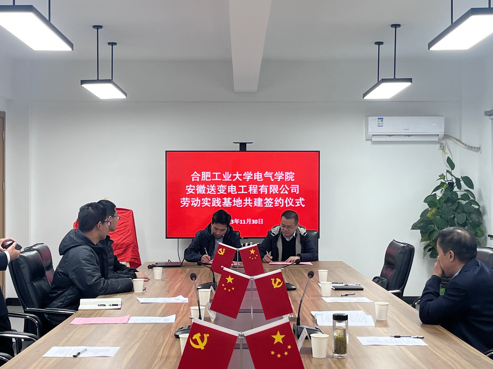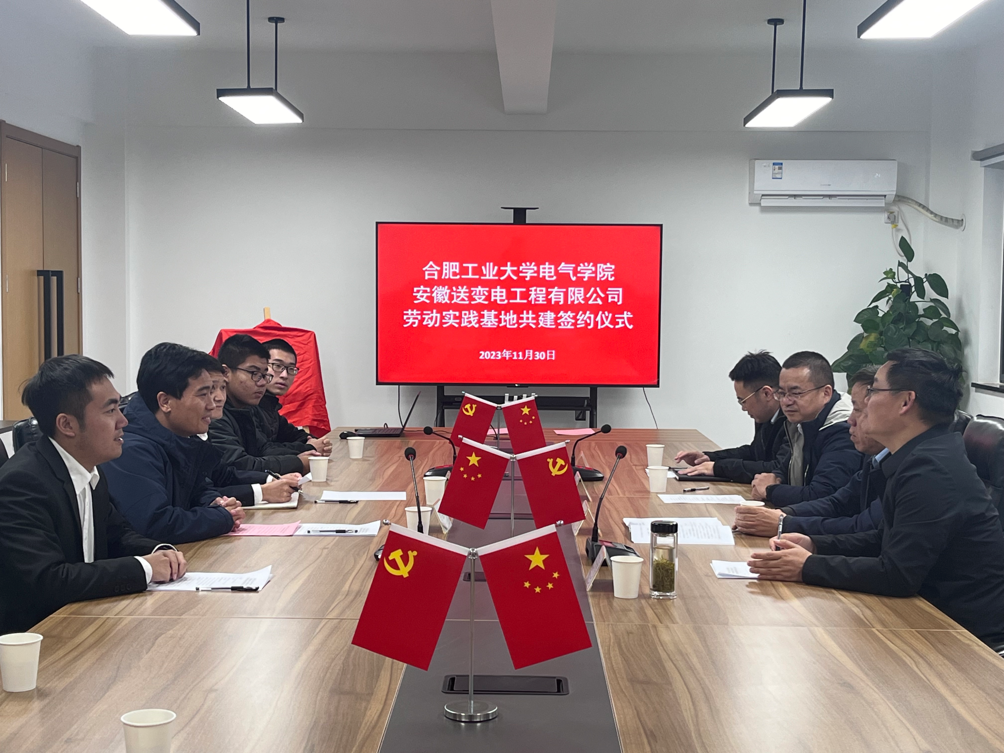11月30日,我校电气与自动化工程学院与安徽送变电工程有限公司共建大学生劳动教育实践基地签约揭牌仪式在送变电工业园会议室顺利举行,安徽送变电工程有限公司纪委书记、工会主席孔闻,全国劳动模范、安徽送变电工程有限公司三级职员王开库,安徽送变电工程有限公司党委组织部(人力资源部)主任陈文斌、副主任宋宇飞,电气与自动化工程学院党委副书记兼纪委书记李丽鹏出席仪式,辅导员和学生代表参加活动。仪式由王开库主持。