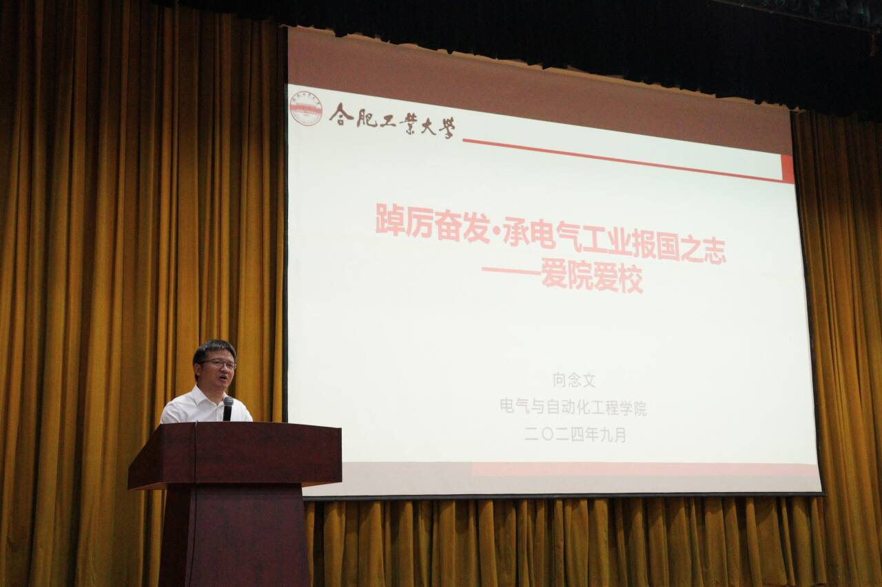 根植爱校深情,逐梦荣校之期。学院院长向念文以《踔厉奋发·承电气工业报国之志》为题,依次讲解了学校发展历史,学院学科建设、师资力量、学科平台建设等情况,以过去学院取得的科研成果为引,深入浅出的引导新生找准专业定位、明确专业价值、内化专业使命,勉励同学们要学会以点带面,不固步自封于小方向、小切口,要多维度、跨方向的建立专业研究互通网,要在“敢坐冷板凳”的孜孜不倦中主动对接国家战略需求,找准机会,突破创新,始终与学校的人才培养目标同向同行,以爱校为基,明确科研底色,以荣校为期,立志工业报国,真正在个人成长中不负小我,在时代进程中不负使命。