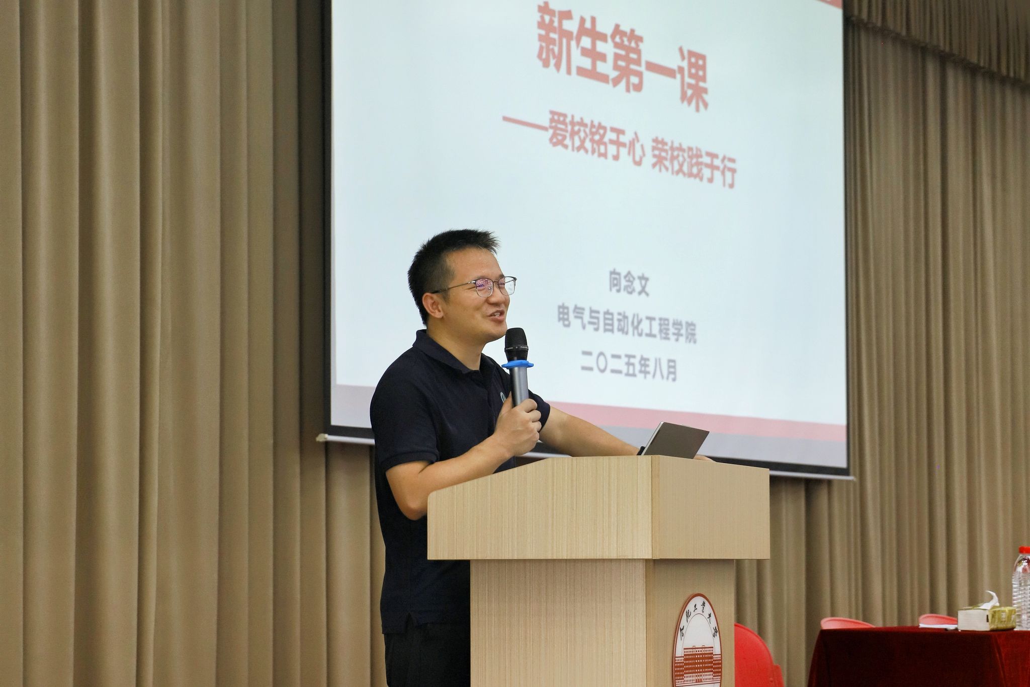 上好学生开学第一课。8月29日,学院院长向念文为新生讲授“院长第一课”,从学院学科发展历程、特色科研方向、人才培养体系及大学生活规划要点等方面展开宣讲,帮助新生初步建立对大学学习生活的整体认知,明确成长目标与努力方向。8月30日晚,学院党委副书记兼纪委书记张栋开展“弘扬青春力量,争做时代新人”为主题的2025级本科生理想信念教育第一课,还围绕“违规违纪违法警示教育”开展校纪校规教育,强化新生纪律观念和规矩意识。