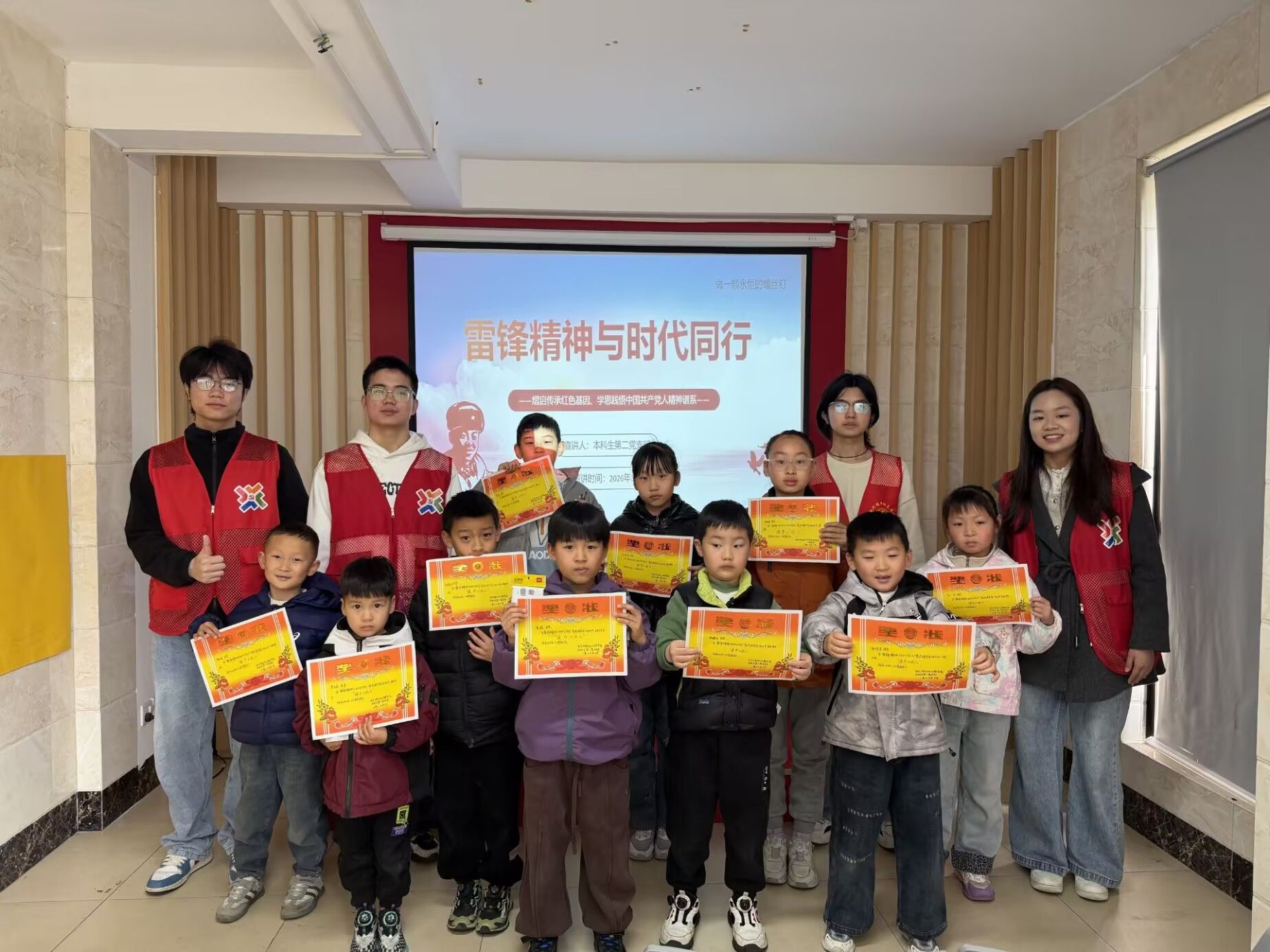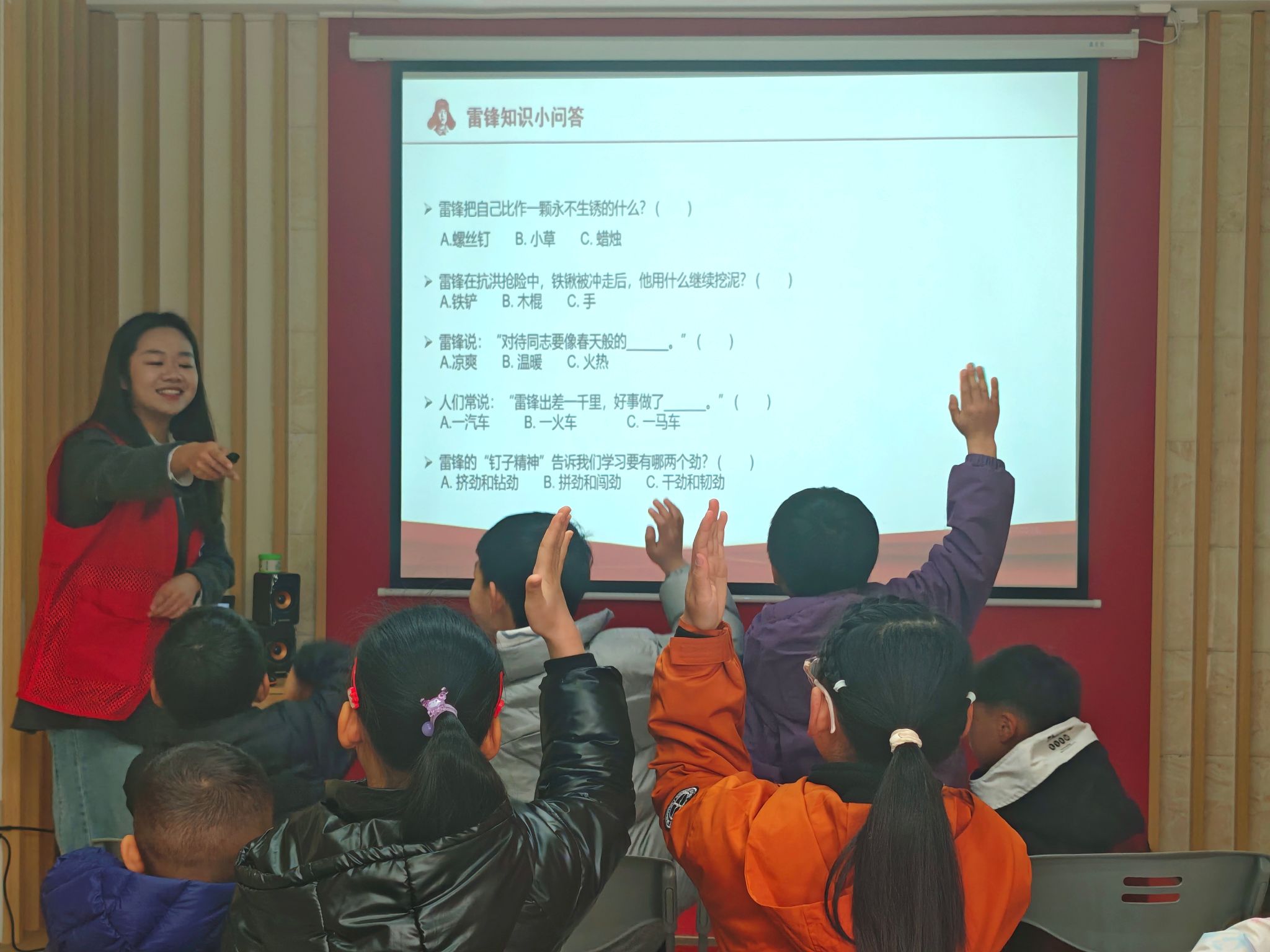 在课程中,主讲人通过播放影片、现场朗诵、提问互动与齐唱红歌相结合的丰富形式,充分调动起孩子们的参与热情,将雷锋精神的传承与青少年的成长成才紧密连接,让孩子们在沉浸式的学习体验中,深刻理解雷锋精神与时代发展、个人成长的深刻关联。